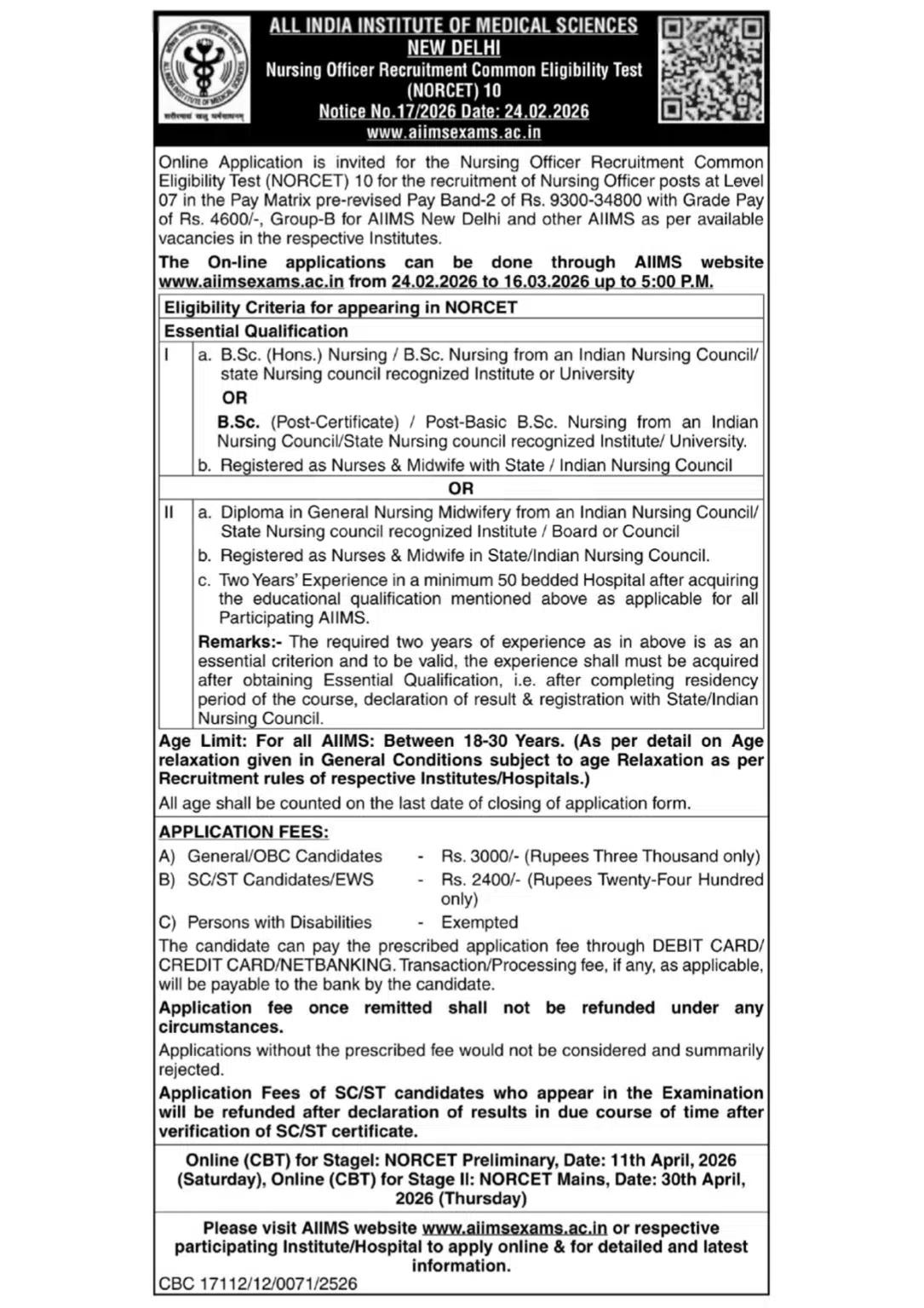 All India Institute of Medical Sciences (AIIMS), New Delhi, has released a short notice on official website for the recruitment of Nursing Officer NORCET 10th Phase Post. This recruitment is for 3000+ positions. AIIMS Application Form has started on 24 February 2026 & the candidates can apply till the 16 March 2026. The Minimum age required is 18 Years & The Maximum Age Is 30 Years as on 16 March 2026. Candidates must check the complete details for AIIMS NORCET 10th Nursing Officer Recruitment 2026 which has given below. (Advt. No. 17/2026)