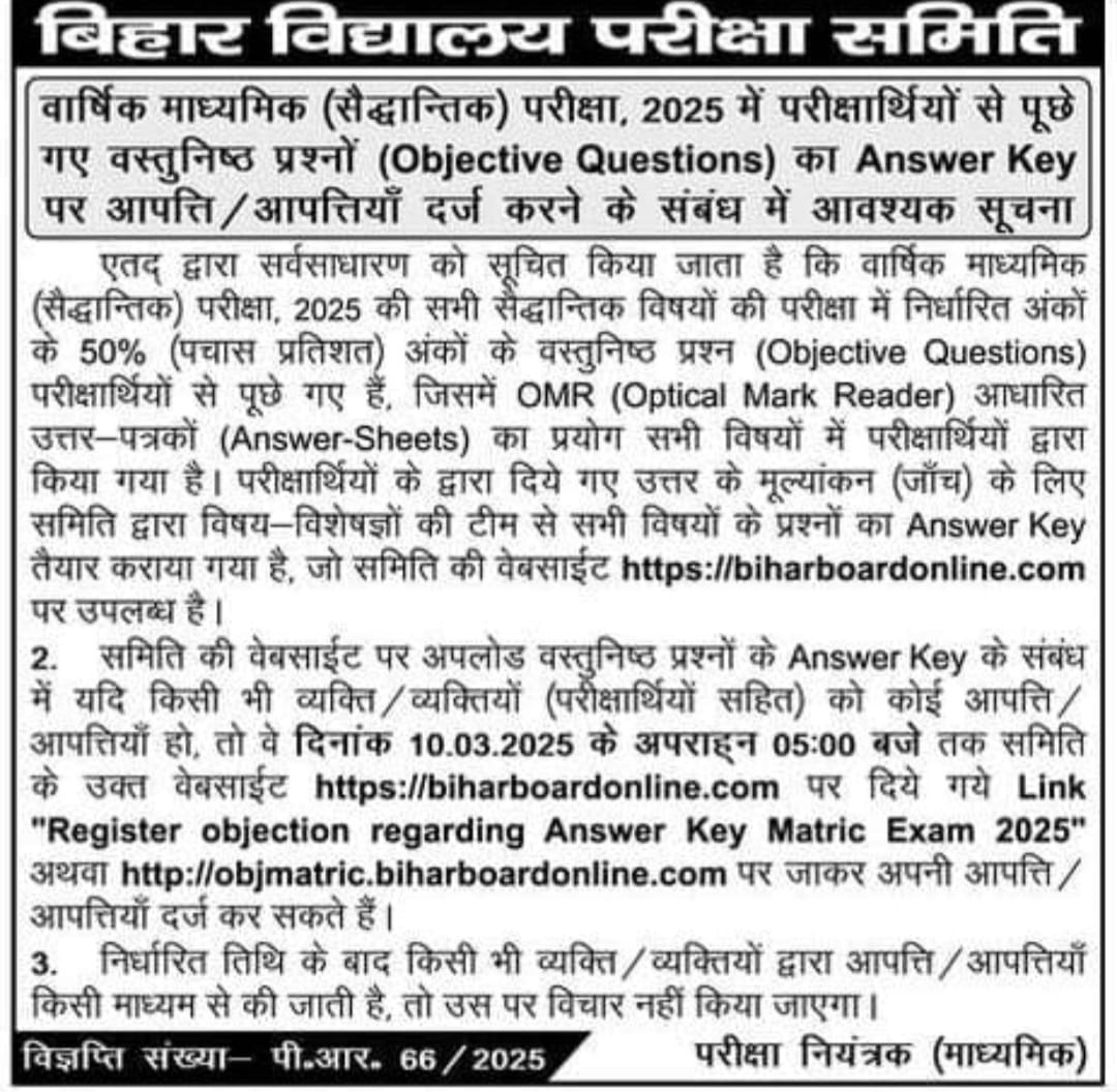 The Bihar School Examination Board (BSEB) has released the Answer Key for the Bihar Board 10th Compartmental Examination 2025 on its official website. Students who submitted the Compartmental exam form can now view their Answer Key through the link provided below. it can be checked using the roll number or date of birth.