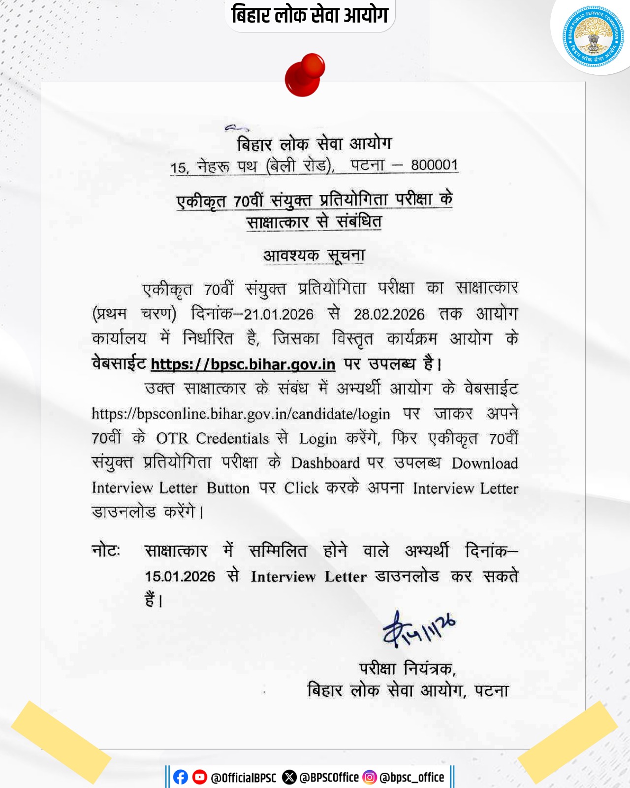 | Bihar BPSC 70th CCE Interview Letter 2026 : Important Question |
