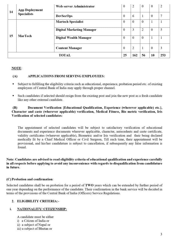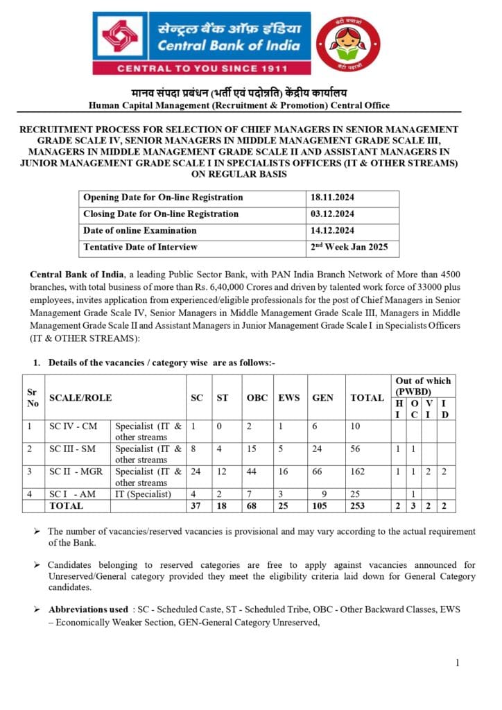 Central Bank of India (CBI), ने अपने अधिकारिक वेबसाइट पर Specialist Officers (SO) in IT and other streams on a regular basis पद की भर्ती का नोटिफिकेशन जारी कर दिया है। CBI द्वारा यह भर्ती 253 पदों के लिए निकाली गयी है। जिसके लिए आवेदन फॉर्म 03 दिसम्बर 2024 तक भरे जाएंगे। जो भी इच्छुक और योग्य उम्मीदवार इस भर्ती के लिए आवेदन करना चाहते है उनके लिए Central Bank of India Specialist Officer (SO) भर्ती से जुडी तमाम जानकारी और आवेदन करने का लिंक नीचे इम्पोर्टेन्ट लिंक सेक्शन में दिया गया है।