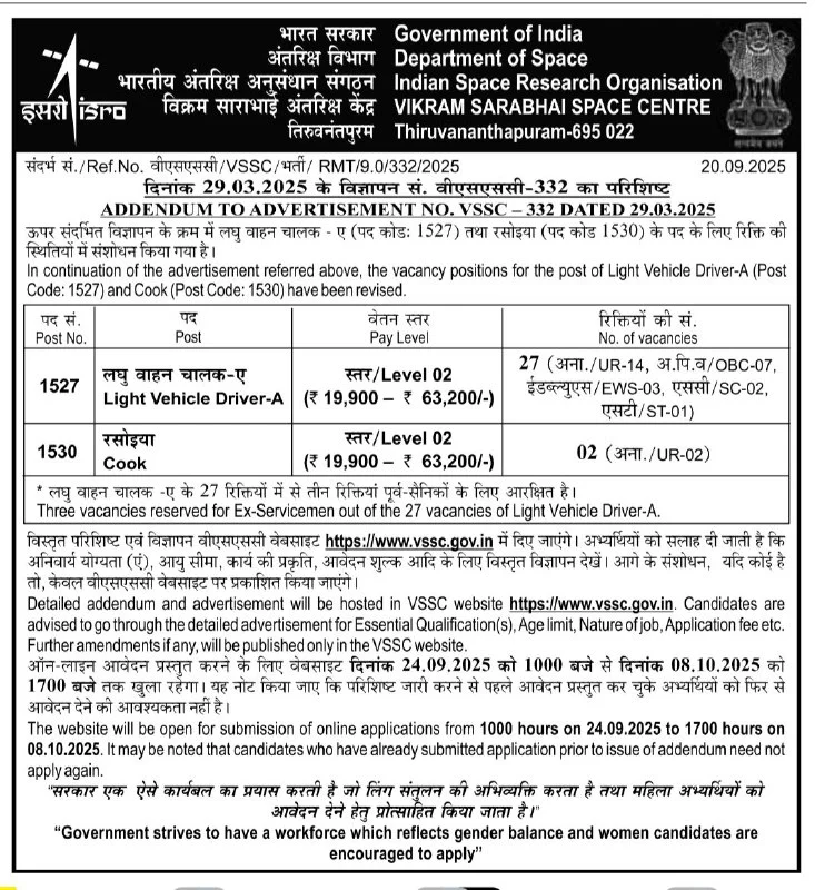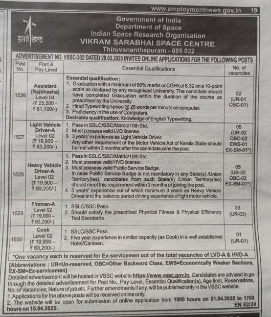 ISRO VSSC Assistant, Driver, Fireman & Cook Notification 2025 : Age Limits As On 15 April 2025