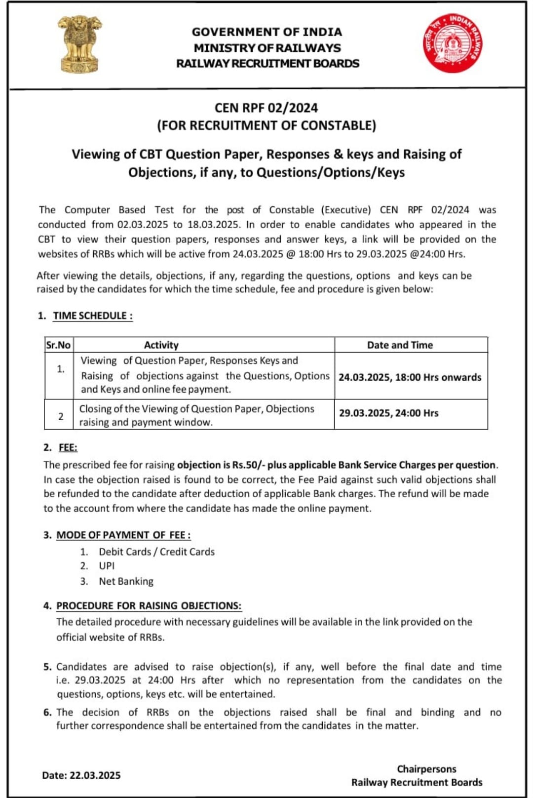 Railway RPF Constable 02/2024 Examination 2025 : Short Details