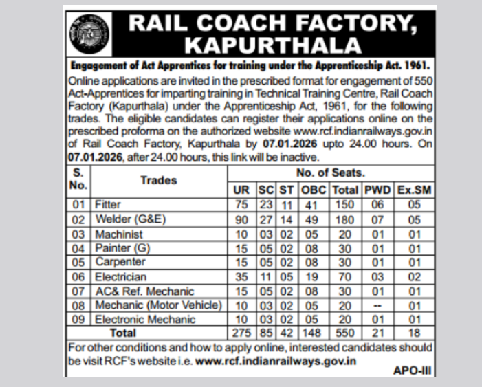 Rail Coach Factory Kapurthala, has released a notification on official website for the recruitment of RCF Rail Coach Factory Kapurthala Apprentice Post.This recruitment is for 550 positions. RCF Application Form has started on 09December 2025 & the candidates can apply till the 07 January 2026. Candidates Can Also Check All Details on Official SarkariExam2026 for RCF Kapurthala Apprentice Recruitment 2026. which has given below. (Notice No.A-1/2025)
