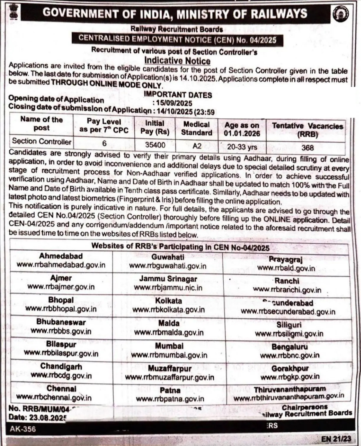 - Candidates are advised to confirm from the RRB official website.