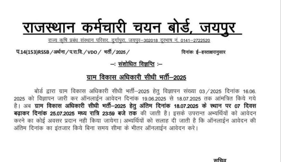 Rajasthan Staff Selection Board (RSSB), has released the Score Card on its official website for the Village Development Officer VDO. The exam was conducted in 02 November 2025, and the last date to submit the application form was 25 July 2025. Candidates can check their Score Card using their Enrollment Number, Registration Number, or Date of Birth by logging into the portal. The direct link is provided below. (Advt No. : 03/2025)